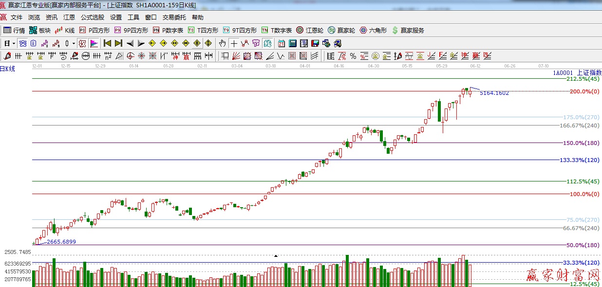 ★依據(jù)贏家江恩理論系統(tǒng)波段百分比提示:滬指在權重大帶動下站上5100點,下一目標是江恩45度5300附近點。