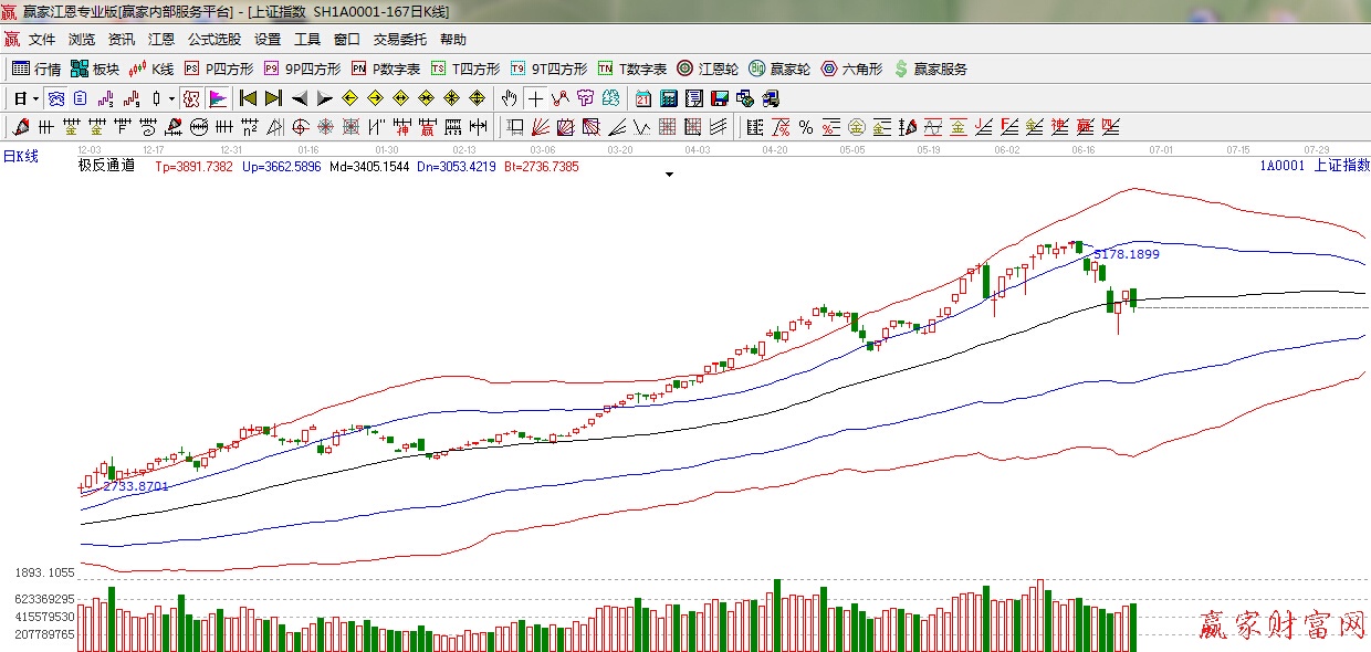 江恩看盤綜述:依據贏家江恩技術工具分析得出:周四早盤滬深兩市小幅高開,隨后滬指圍繞日線生命線窄幅震蕩,午后上演跳水行情,滬指一度跌逾4%,銀行等權重、國資改革題材的反水,使得大盤受到巨大的沖擊,短期市場將以時間換空間,有望圍繞下方江恩180度支撐震蕩整理,夯實中期底部,下一個短線時間窗口6月29日,30日。操作上,控制倉位的前提下,中線金融股逢低繼續跟進,首選仍是券商;短期可關注煤炭、有色等二、線藍籌。另外,軍工和國資改革也可波段關注。
