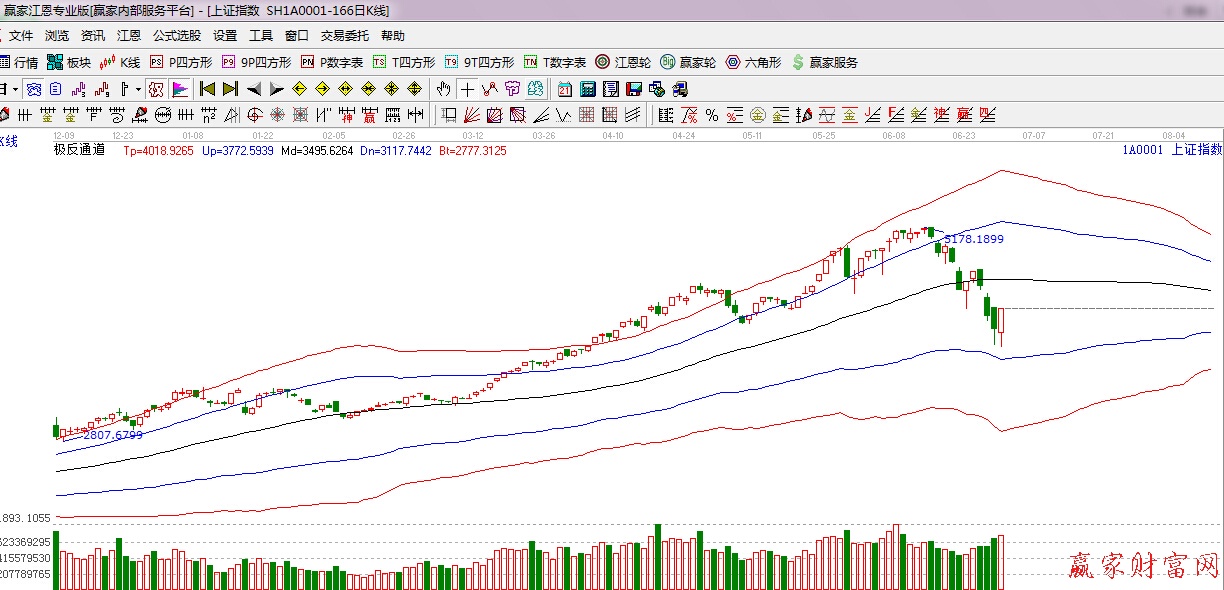 江恩看盤綜述:依據贏家江恩技術工具分析得出:生命線之下弱勢區域,藍色外軌線支撐,依據物極必反規則,今日如期反彈,大幅的反彈暫時消除了暴跌的恐慌,雖然今日觸底暴漲,但真正底部還需要時間來修復,因此反彈之后,控制好自己的倉位,為迎接最終底部做準備,操作上,中線金融股逢低繼續跟進,煤炭、有色等二線藍籌也可適當關注。