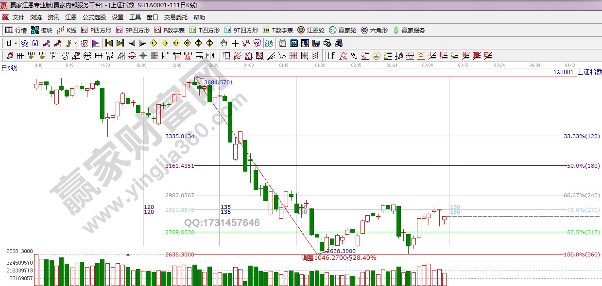 江恩看盤綜述:依據贏家江恩技術工具分析得出:周三的市場,總體呈現低開反抽,尾盤銀行板塊再一次出現護盤,市場維穩需求強烈,近期市場大概率將以震蕩調整為主。手中持有股票的投資者可在盤中尋找機會,適當做T以降低持股成本。下一時間窗口3月17日左右。