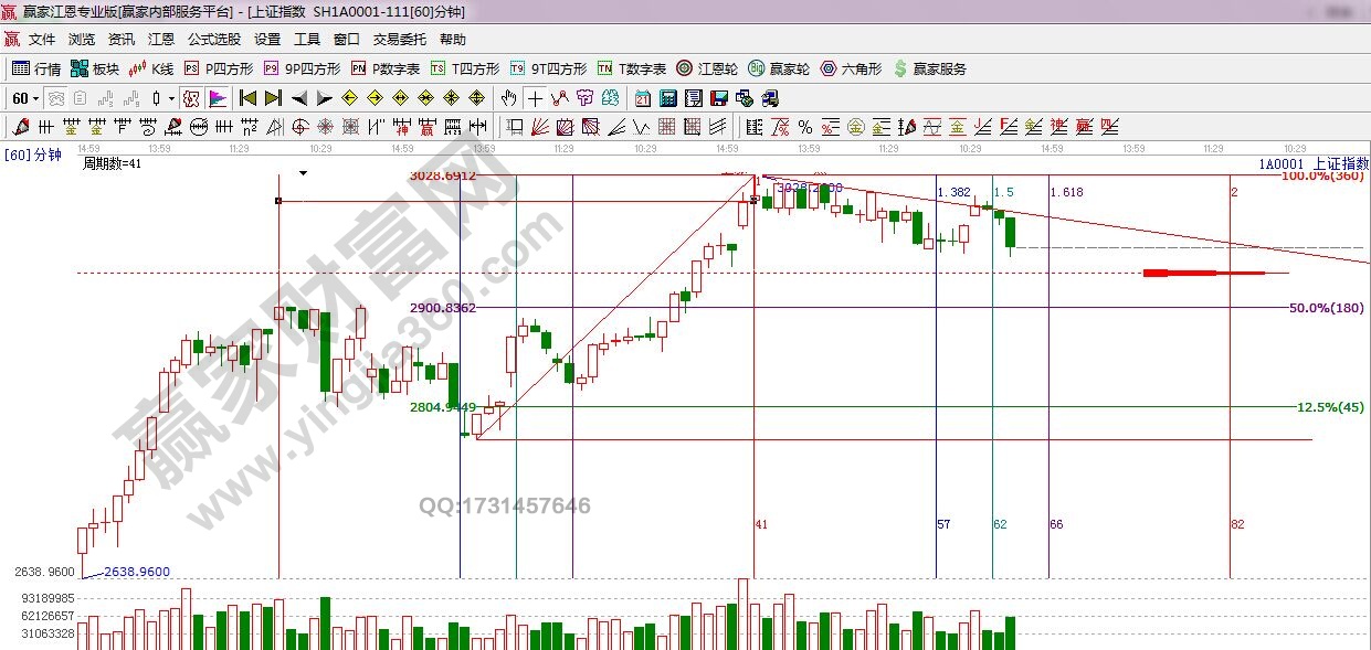 ☆ 依據贏家江恩理論系統江恩波段百分比線提示:周一沖擊3000點遇阻回落,下方支撐、2930點,2900點附近。