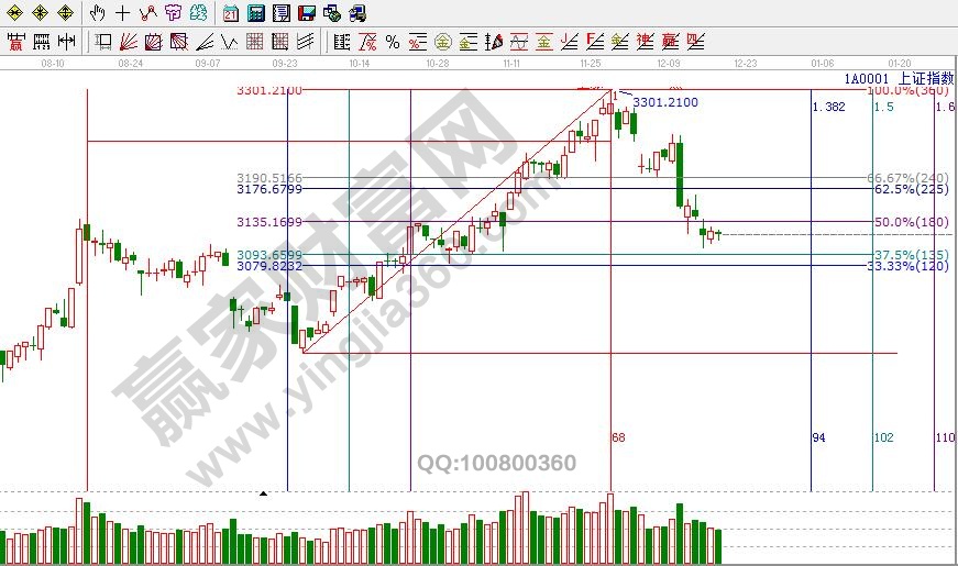 ★依據贏家江恩理論系統極反通道提示:滬指繼續圍繞短周期60分藍色線弱勢整理,當下15分周期阻力是3130點,支撐3080--3090點附近。
