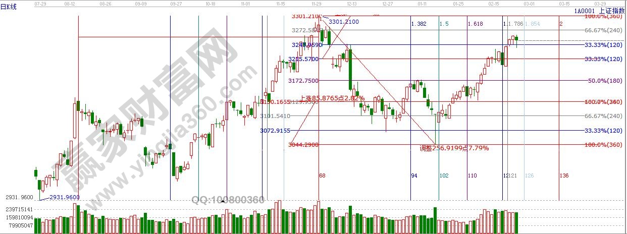 ☆依據(jù)贏家江恩理論系統(tǒng)江恩波段百分比線提示:依據(jù)百分比分析阻力位是3272點附近,支撐位3243點附近,3215點附近。