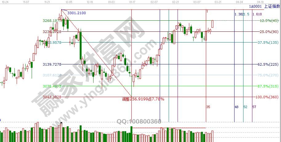 ☆依據贏家江恩理論系統江恩波段百分比線提示:盤中突破3250點, 上方45度線是3269點,支撐位置是3236點,極反通道壓力3285點.
