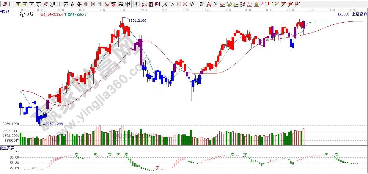 ★依據贏家江恩理論系統乾坤K線提示:紅色關注線上方,由紫色k線轉入紅色k線,依據規則,看多做多。