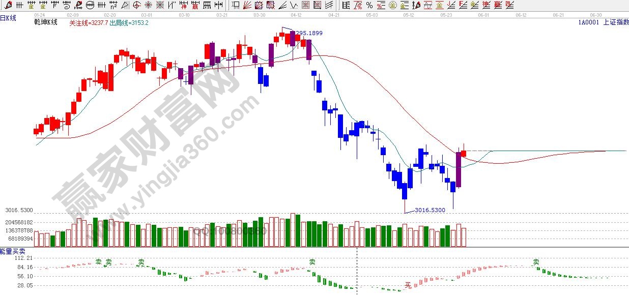 ★依據贏家江恩理論系統乾坤K線提示:紫色警示k線出現,并突破紅色關注線,看多。