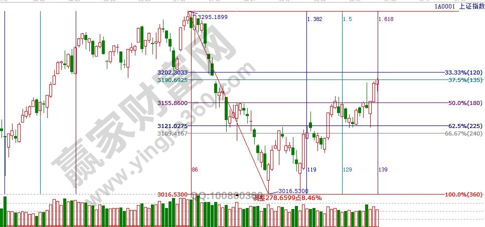 ★依據(jù)贏家江恩理論系統(tǒng)江恩波段百分比線提示:周二,滬指高位震蕩,向上回補(bǔ)3196缺口,此區(qū)間和江恩135-120度位置共振,135度-120度阻力位3190--3200區(qū)間。支撐180度3155點(diǎn)附近。