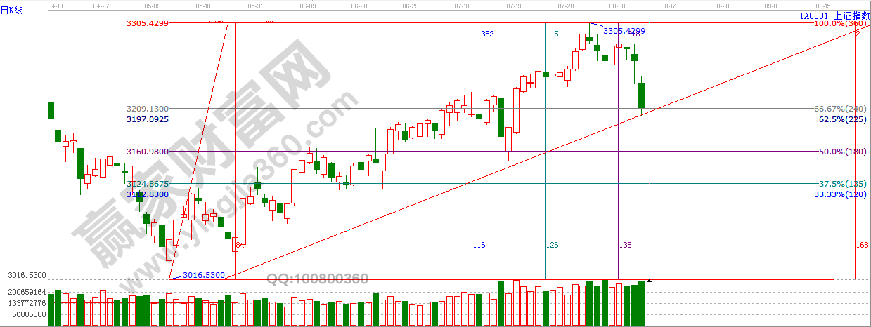 ☆依據贏家江恩理論系統江恩波段百分比線提示:滬指回抽3264點未收復,今日低開繼續下探,連續破位3233點,3209點,最低接近225短線3297點附近,下周關注3297點關鍵位置,百分比180度在3160點附近。