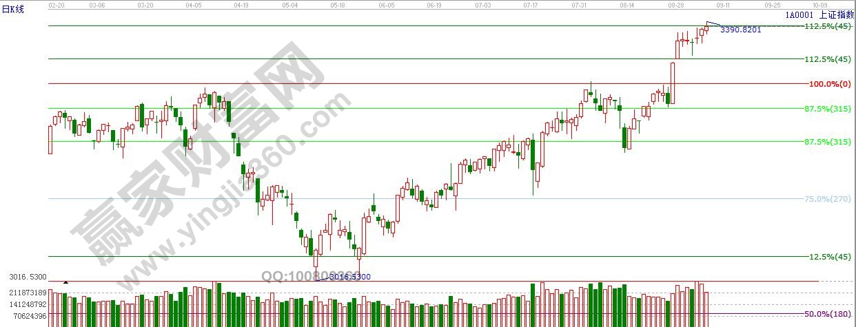 江恩看盤綜述:依據贏家江恩技術工具分析得出:周二,滬指縮量創反彈新高,短期動能有所衰減,繼續上行的空間逐步縮小,預計短線3400點附近或有震蕩,適當謹慎。盤中個股活躍,操作性比較強,但切勿盲目追漲,對于近期漲幅較大的注意逢高減持,本周時間上留意9月8日左右,操作上,重個股為主,重點關注低位反彈較少,基本面良好的標的。
