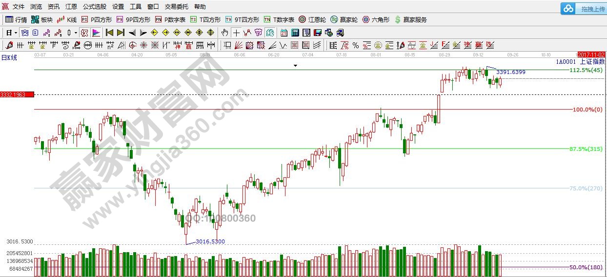 ☆依據贏家江恩理論系統江恩波段百分比提示:45度附近3390附近遇阻回落,當下支撐缺口是3330點附近,下方0度線是3300點附近。