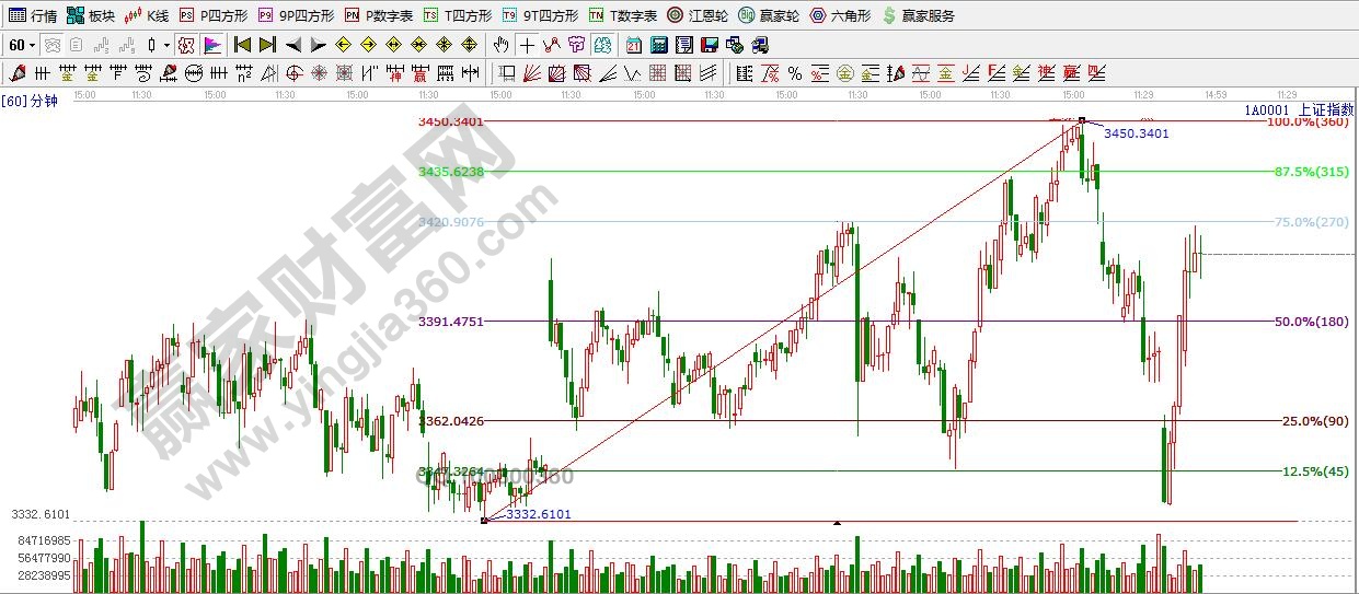 ☆依據贏家江恩理論系統江恩波段百分比提示:周一,試探270度3342點附近,止跌回升,今日延續反彈趨勢,盤中圍繞昨日提到3412點阻力上下震蕩,接下來,3412--3420依然是阻力區間,支撐3400點,3380點附近。