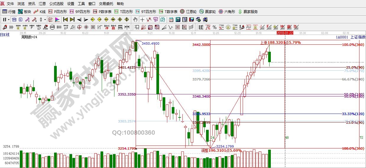 ★依據(jù)贏家江恩理論系統(tǒng)江恩波段百分比提示:滬指在創(chuàng)日線新高,短線支撐依舊是3401點(diǎn),以及240度3380附近。