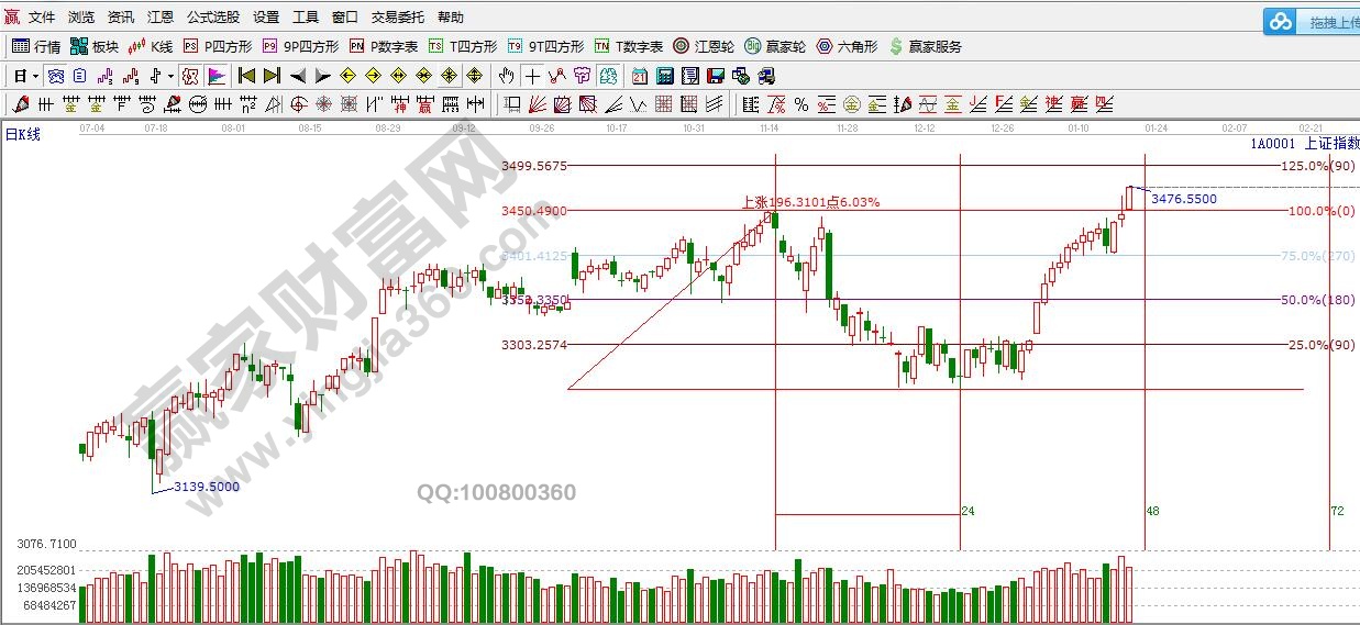 ★依據(jù)贏家江恩理論系統(tǒng)江恩波段百分比提示:滬指在創(chuàng)新高,3450點轉(zhuǎn)變?yōu)橹危俜直饶繕宋辉?0度3499點附近。