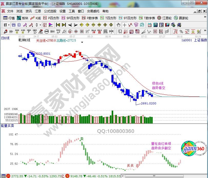 江恩看盤(pán)綜述:通過(guò)贏家江恩系統(tǒng)趨勢(shì)、時(shí)間、價(jià)格工具綜合評(píng)判市場(chǎng)一星看多(五星評(píng)級(jí)標(biāo)準(zhǔn))。滬指日線依托極反通道藍(lán)線下軌線震蕩,7月6號(hào)最低點(diǎn)2691點(diǎn)對(duì)應(yīng)的是月線藍(lán)色下軌線,周線藍(lán)色下軌線是2640附近,周、月線的下軌線走平,在一定程度上限制了下行的空間;短周期15、30、60分鐘均處于生命線下弱勢(shì)通道,單從K線位置而言,懸空可上可下?tīng)顟B(tài),20號(hào)早盤(pán)11點(diǎn)是日內(nèi)時(shí)間窗,15分鐘生命線是2787點(diǎn),對(duì)應(yīng)藍(lán)色下軌線中2750附近,明日觀察時(shí)間窗與價(jià)格的有關(guān)系,遵循線上支撐線下阻力原則。