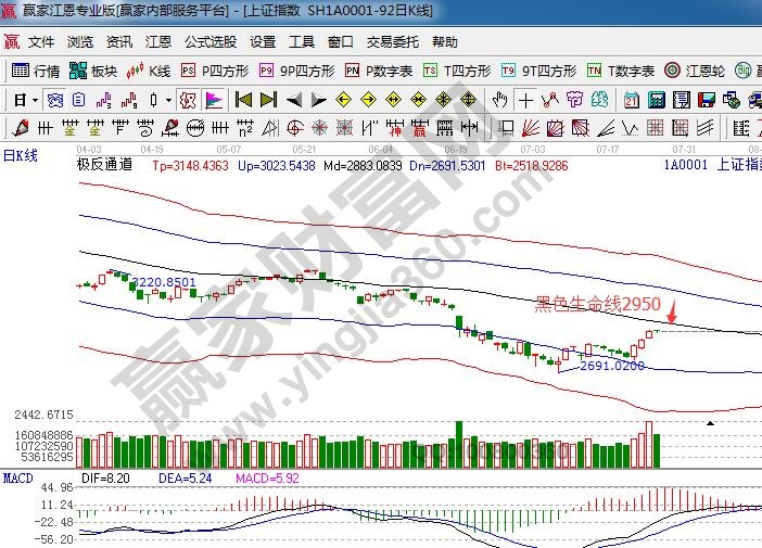 ☆依據(jù)贏家江恩理論系統(tǒng)極反通道提示:滬指短周期15、30分鐘失守藍(lán)色強(qiáng)勢上軌線,按失守一線看低一線規(guī)則,15分鐘生命線2890附近是高位橫盤整理的防守線,并且此線是短線操作的參考線,是判斷高位橫盤上漲的中繼還是反彈的結(jié)束做頭的依據(jù),隨著時間推移,日線生命線將下移到2950以下,生命線下移對于未來突破則是利好,反之下移會制約反攻的空間。按規(guī)則15分鐘生命線上短線看多,又因日線處于弱勢,中線看空。