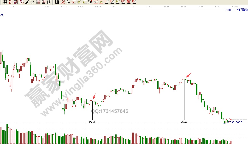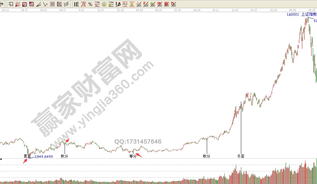 例如:2013年歷史重要低點(diǎn)1849出現(xiàn)在6月25日(6月1日誤差兩天),9月23日見(jiàn)階段高點(diǎn),2014年大行情的啟動(dòng)點(diǎn),開(kāi)始于3月21日(春分).