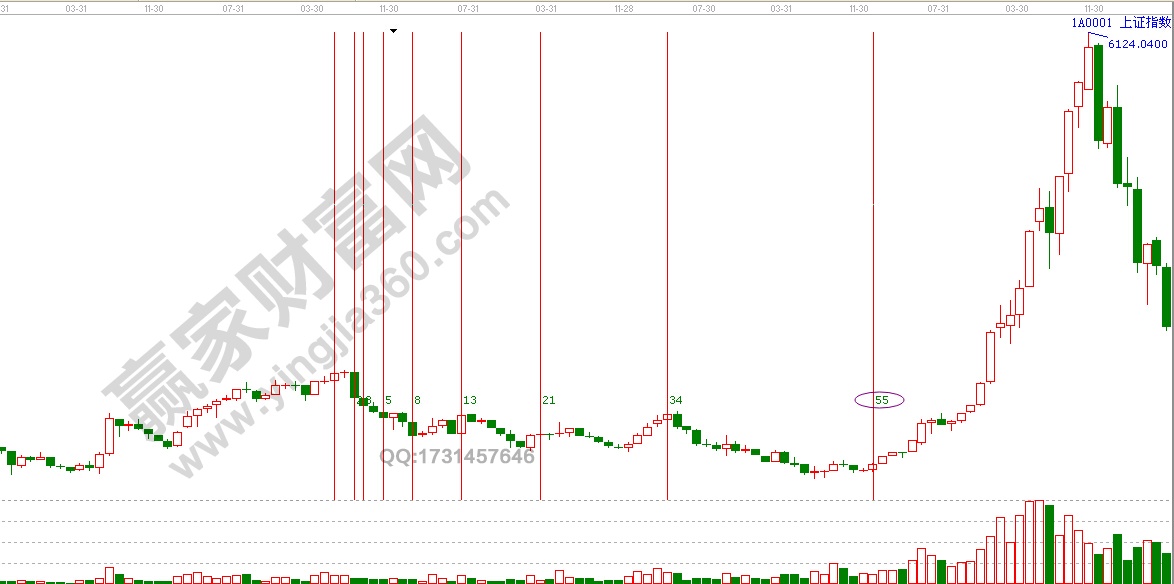 從998點開始向上數一個斐波那契數列,如圖紅色數字標注,到55的時候正好是2009年12月,也就是3478點的次高點位置,新一輪熊市啟動的地方。