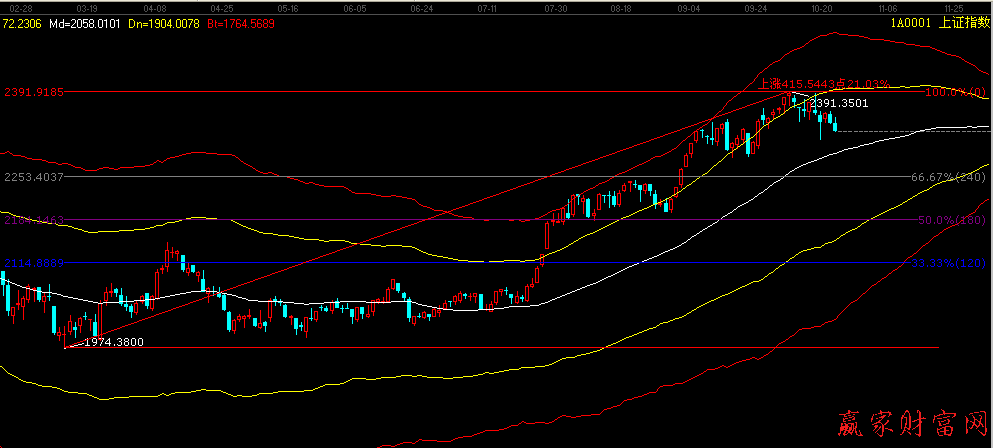 技術分析:依據贏家江恩系統極反通道提示,大盤目前在極反通道生命線和黃色上軌線之間運行,均線看大盤今日已經跌破30線,短期看空,后市支撐點2290點附近。