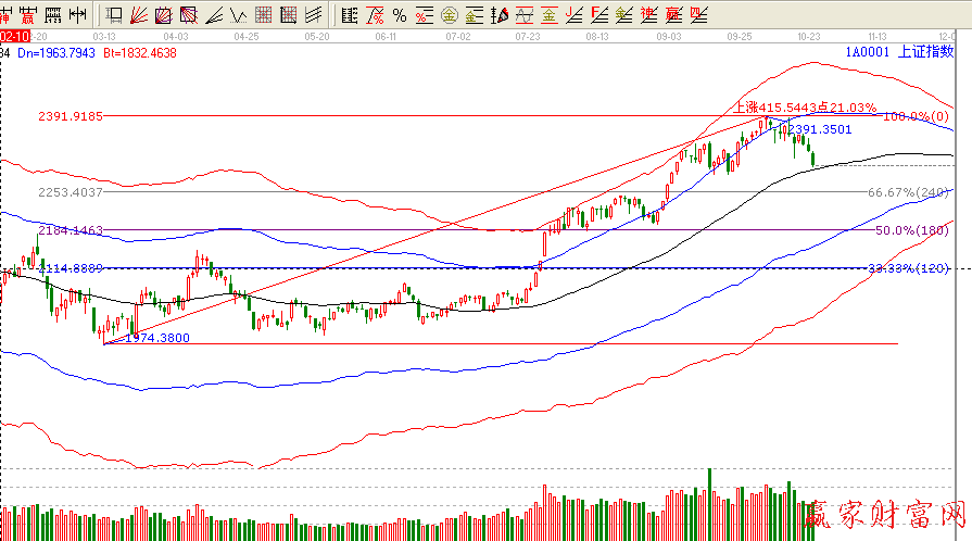 技術分析:如下圖大盤今日在十一點以后再次跳水,從圖中可以看到大盤今日回調到極反通道生命線線上軌線的位置,明日重點關注生命線位置的支撐強度,以及2290點附近能不能止跌。