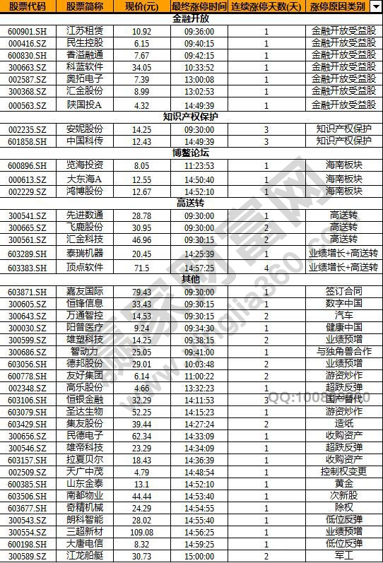 盤(pán)面上,多元金融板塊表現(xiàn)搶眼,香溢融通(600830)、江蘇租賃(600901)等4股漲停,市場(chǎng)避險(xiǎn)情緒,黃金延續(xù)強(qiáng)勢(shì)。知識(shí)產(chǎn)權(quán)概念股大漲,安妮股份(002235)、中國(guó)科傳(601858)三連板。醫(yī)療器械概念股大漲,科藍(lán)軟件(300663)漲停。近期高位強(qiáng)勢(shì)股午后殺跌,近期強(qiáng)勢(shì)股阿科力(603722)、誠(chéng)邁科技(300598)、九典制藥(300705)、惠威科技(002888)、宏輝果蔬(603336)等集體跌停。臨近尾盤(pán),海南股再度受資金追捧,大東海A(000613)、覽海投資(600896)、海峽股份(002320)等多股漲停。