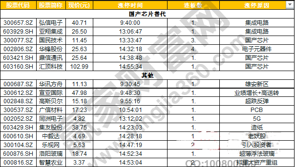 盤面上,有報道稱中國行業和監管機構將商討推進本土芯片產業發展措施,芯片概念股逆市走強,華鋒股份(002806)四連板,弘信電子(300657)、國民技術(300077)等漲停。雄安概念股午后集體拉升,北京科銳(002350)盤中一度封板。樂視網(300104)再度漲停,四天三板。海南板塊大幅殺跌,海航創新(600555)、鈞達股份(002865)等觸及跌停,羅牛山(000735)、羅頓發展(600209)、海南瑞澤(002596)、海南高速(000886)、海峽股份(002320)等個股大跌。