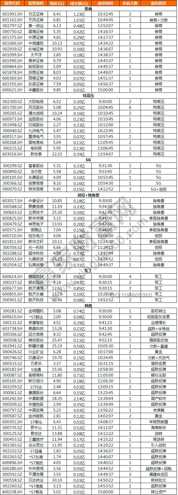 盤面上,午后國產軟件板塊有所拉升,中昌數據(600242)漲停;上海市委書記李強同12位科創企業代表座談,受此消息影響,獨角獸板塊全線拉升,熙菱信息(300588)、神思電子(300479)等多股漲停;風范股份(601700)再度漲停,收獲6連板,帶動特高壓概念全線走強,寶勝股份(600973)、置信電氣(600517)等多股漲停;券商板塊再度爆發,板塊指數漲近9%,方正證券拉升漲停兩連板;軍工板塊再度拉升,航天通信(600677)、航天長峰(600855)等多股漲停;5G板塊個股分化明顯,法爾勝(000890)、富春股份(300299)等多股漲停。