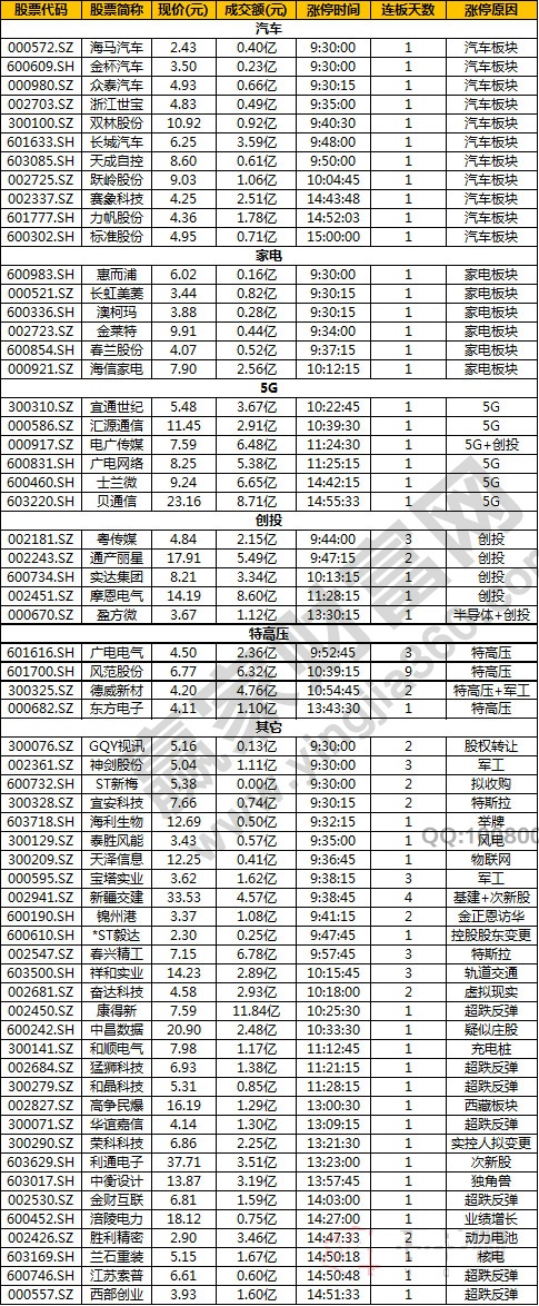 盤面上,汽車、家電板塊開盤大漲,金杯汽車(600609)、海馬汽車(000572)等多只個股漲停;5G板塊早盤走強,匯源通信(000586)、新海宜(002089)等多股強勢封板;特高壓板塊表現較為強勢,風范股份(601700)收獲九連板;創投板塊卷土重來,通產麗星(002243)、摩恩電氣(002451)、粵傳媒(002181)等多股漲停。