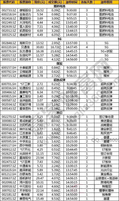 燃料電池、5G、煤炭 封板效率:較高