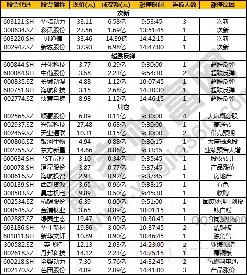 盤面上,次新股成最熱門板塊,華培動(dòng)力(603121)、新農(nóng)股份(002942)、興瑞科技(002937)等多股集體漲停;年報(bào)行情來(lái)襲,英菲特、東方新星(002755)等多股漲停;低價(jià)股成市場(chǎng)主線,近6成漲停個(gè)股股價(jià)不足10元。