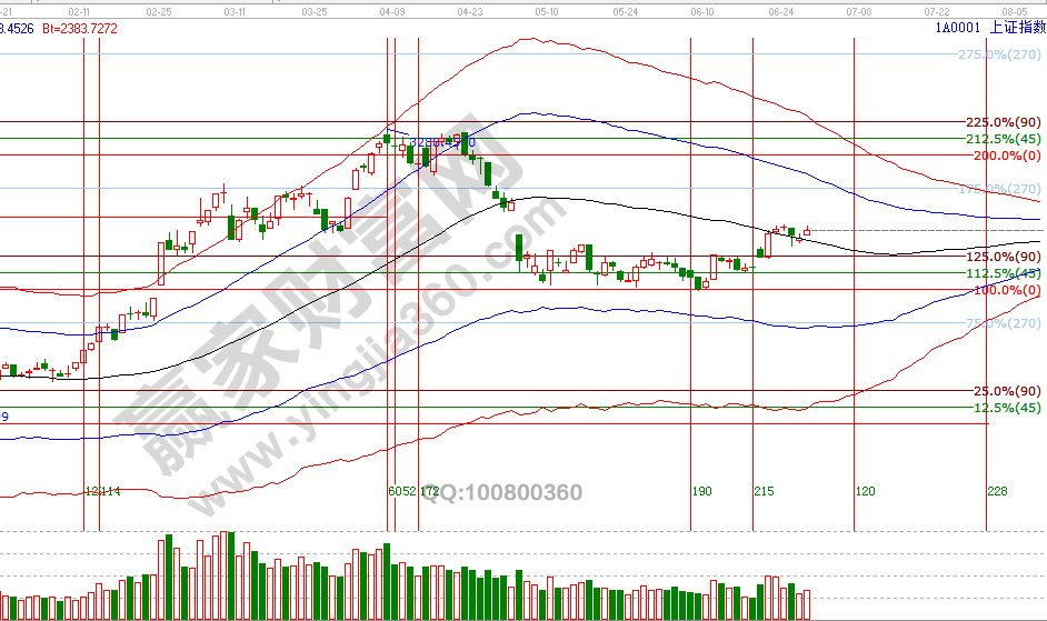 截至今日收盤A股滬深指數(shù)時(shí)隔39個(gè)交易日再度雙雙收復(fù)極反通道生命線,先行指數(shù)上證50已上攻至藍(lán)色上軌線反壓附近,結(jié)合各周期走勢大盤將延續(xù)反彈動作;空間點(diǎn)位方面,江恩價(jià)格四方形、波段百分比線工具顯示,3016-3036區(qū)間同極反通道短周期共振,按買在支撐賣在壓力原則,2840附近支撐位買入,第一目標(biāo)位2950減一次倉,接下來3016-3036區(qū)間附近又一次分批獲利參考位;時(shí)間方面,7月3號是下一個(gè)日線時(shí)間窗口,6月27號盤中壓力是45度3016點(diǎn)、90度3036點(diǎn),盤中支撐是270度2961點(diǎn)、315度2978點(diǎn)。操作策略,指數(shù)極反通道生命線附近震蕩,反彈延續(xù)中,整體持倉保持3-5左右。