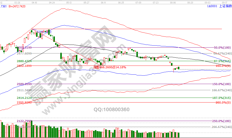 9號(hào)大盤最高點(diǎn)2808點(diǎn)(測(cè)算反壓2808一點(diǎn)不差),最低點(diǎn)2770點(diǎn)(測(cè)算支撐2772,僅相差2點(diǎn)),20年來(lái)贏家江恩大勢(shì)分析均是通過(guò)系統(tǒng)工具規(guī)則提前測(cè)算,歷史上重要時(shí)間、價(jià)格拐點(diǎn)都做有判斷,預(yù)判未來(lái)市場(chǎng)最有效的方法就是研究歷史。再談行情,下跌趨勢(shì)已確認(rèn),這在月初已闡述過(guò),未來(lái)市場(chǎng)重要的時(shí)間參考點(diǎn)是9月、空間位置是月線藍(lán)色下軌線(學(xué)員通過(guò)極反通道工具獲取位置),這個(gè)觀點(diǎn)是7月中下旬公開(kāi)課中有講過(guò),當(dāng)前這里定性的是反抽(級(jí)別很小,反彈都稱不上),保持6號(hào)觀點(diǎn)空間上看2744-2822,時(shí)間上9、16號(hào),8號(hào)分析中談到價(jià)格需要等待時(shí)間,本周需要觀察等待期是以時(shí)間換取還是空間換取,因?yàn)榧?jí)別太小,信號(hào)持續(xù)度隨之減弱,周初繼續(xù)觀察日線藍(lán)色下軌線支撐。8月12號(hào)盤中壓力是180度2800點(diǎn)、135度2786點(diǎn),盤中支撐是45度2757點(diǎn)、0度2743點(diǎn),日線時(shí)間窗口是16號(hào)。操作策略,指數(shù)生命線下弱勢(shì)區(qū)域運(yùn)行,藍(lán)色下軌線震蕩,激進(jìn)者最多3成倉(cāng)交易,穩(wěn)健者空倉(cāng)休息。
