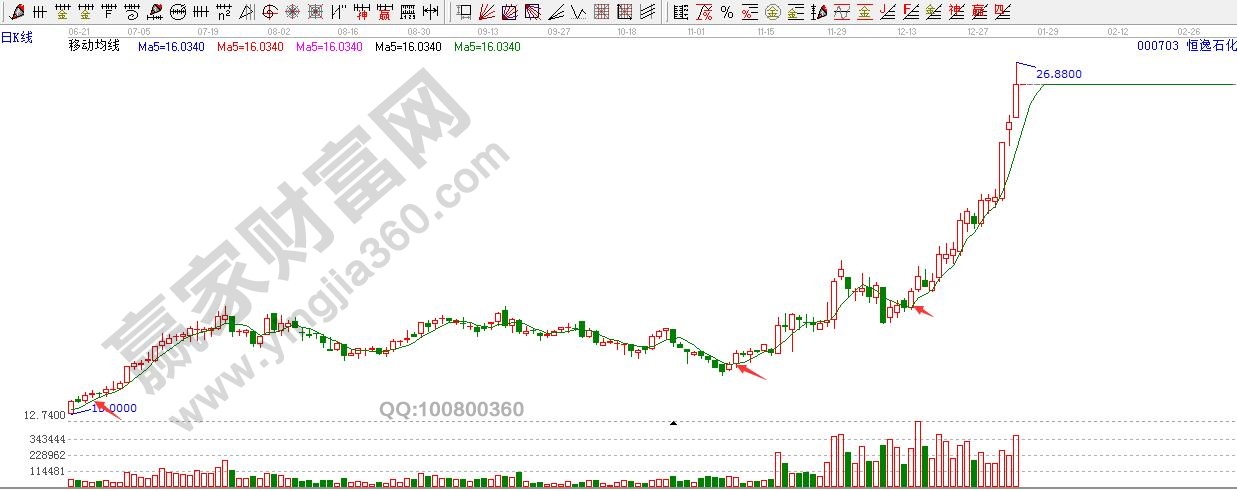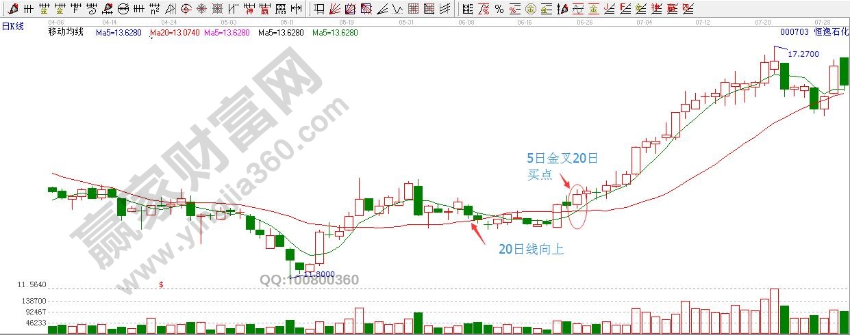 首先介紹一下520戰(zhàn)法。520這套戰(zhàn)法是兩條均線的組合,是選擇一條短期5日均線和一條20均線參數(shù)組合。問題來了,為何選取5和20均線呢?因為5日均線又叫“攻擊線”5日均線波動較快,更貼近股價的走勢,所以,在信號上更加迅速。5日之上的個股本身就比較強勢。例如下面的恒逸石化走勢圖。