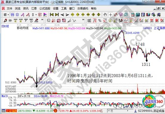 打開上海大盤,我們發(fā)現(xiàn)小周期循環(huán)為0.5年,其它周期循環(huán)是小周期循環(huán)的N倍。這樣我們就以117日均線作為小周期循環(huán)0.5的均線。這種設(shè)法在實(shí)戰(zhàn)中會(huì)怎么樣的?如上圖所示,我們將1996年1月低點(diǎn)512作為大3浪的開始點(diǎn),已經(jīng)有8年之久,大盤會(huì)不會(huì)受到8.5年均線支撐呢?在2003年1月6日上證大盤下跌到1311點(diǎn),準(zhǔn)確無(wú)誤落在8.5年均線之上,而且當(dāng)時(shí)這個(gè)8.5年均線也是1311,大家可以調(diào)出相應(yīng)的均線進(jìn)行觀察。