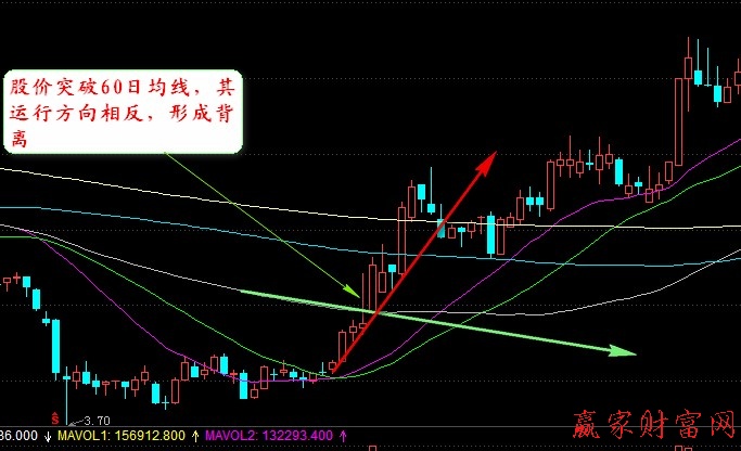 2.另一種情況是,股價與被擊穿的均線的方向也是“交叉”并相反的,這也是均線背離的現象。
