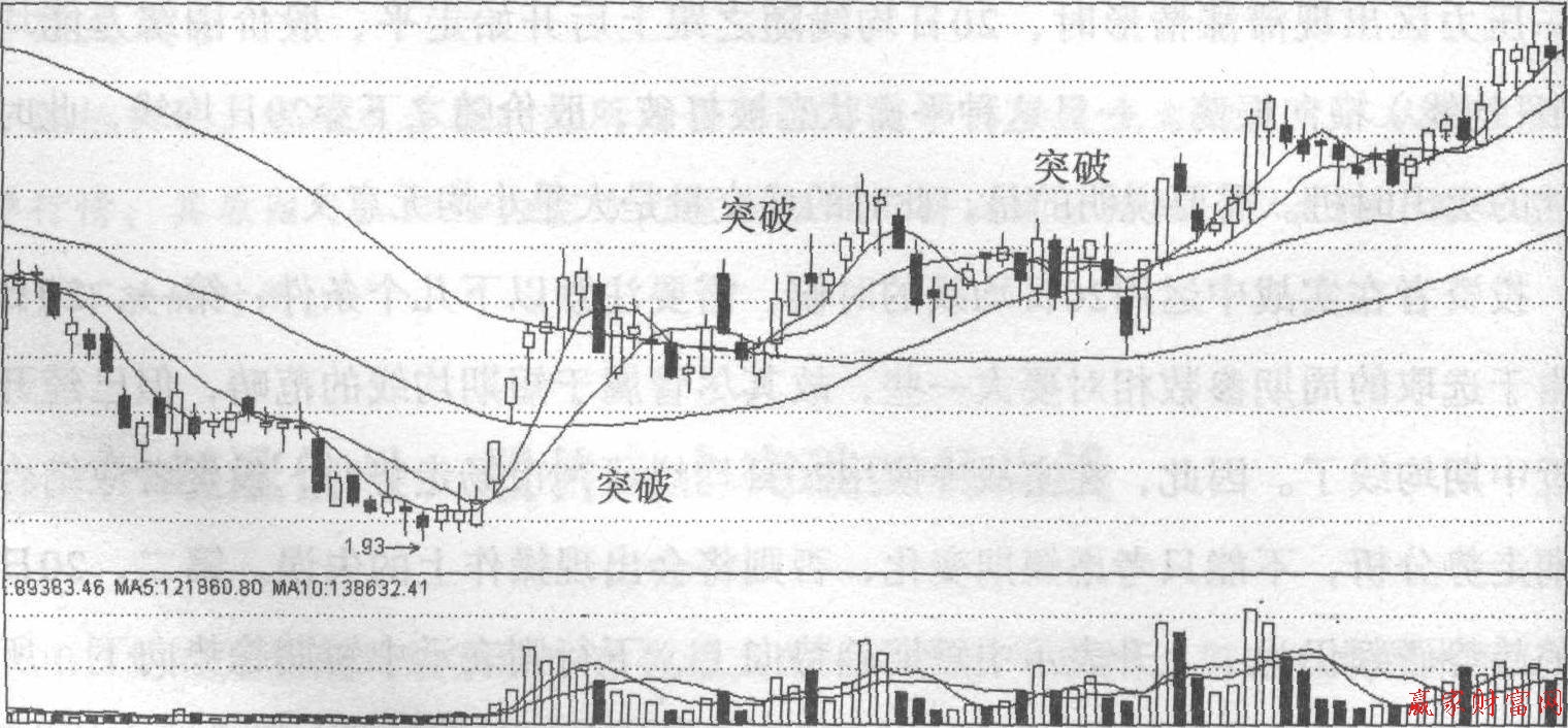 在市場的實際操作過程中,投資者一旦發(fā)現股價自下而上突破均線并繼續(xù)向上 的情況出現,可以視此為買入時機。 概括來講,均線由下降逐漸轉為上升,而股價曲線從均線下部突破均線交叉向上,此時為買進信號。值得投資者注意的一點是,移動平均線一定要有向上抬頭的跡象,說明市場行情由跌轉漲,此時為買進信號才更確切。若市場為空頭市場,而且此時的股價是自下而上依次突破短期、中期均線的時候,也是投資者應該抓住的買入時機。