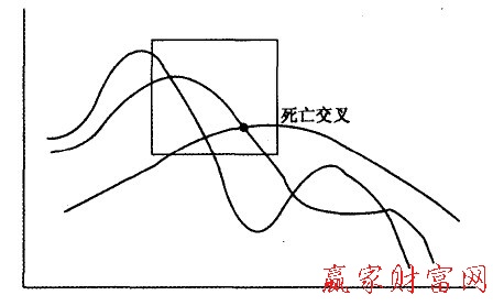 死亡交叉是指股價線、短期、中期、長期均線依次有規則地從上往下穿行,形成交叉,即股價線從上往下穿過短期、中期、長期均線;短期均線由上往下穿中期、長期均線,中期均線由上往下穿長期均線,這樣有規則地交叉將形成三角狀的交叉,稱之為死亡交叉,它是一個重要的反轉信號,預示著行情可能會短期、中期的回調或反轉下跌。此時是風險較小的賣點。死亡交叉與空頭排列緊密相連,是確立空頭排列行情成立的前期步驟。如圖2所示。