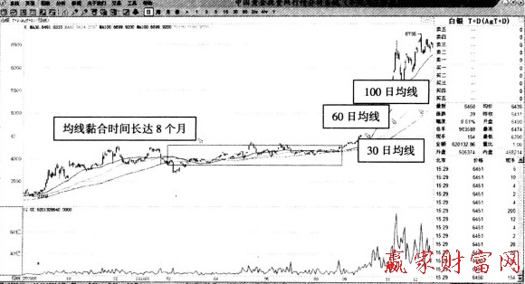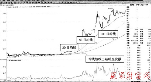 白銀T+D——均線向上發散形態,如圖所示。白銀T+D的日K線中顯示,均線長期黏合的形態出現了轉變。從圖中看來,三條不同的均線(30日、60日、100日)已經開始快速發散,顯然是投資者做多的信號。白銀價格持續拉升的時候,各條均線之間的距離逐步拉開。發散形態明顯形成之前,投資者不容易判斷這樣的價格趨勢。均線的發散程度是相對的,從黏合到發散狀態也需要一個過程。這樣一來,投資者做多開倉的操作可以漸進進行,而不是一次性地重倉買入白銀。隨著均線理論發散形態逐漸明確,白銀價格的回升趨勢也在不斷得到確認,這個時候的加倉動作就非常安全了。面對均線持續發散的大趨勢,投資者買漲獲利再無較大的風險。