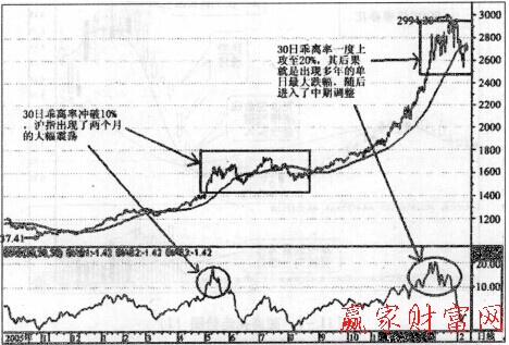 如滬指在本輪牛市上升趨勢(shì)中,出現(xiàn)了很明顯的兩次中期調(diào)整,震蕩幅度加大,大陰線(xiàn)經(jīng)常出現(xiàn),與此同時(shí),很多個(gè)股也跟隨大幅下跌跳水,投資者如果沒(méi)有提前判斷。將損失很多到手的利潤(rùn),而這時(shí)乖離率就為我們提供了很好的建議。滬指在2006年5月中旬,在2007年1月下旬,30日乖離率都超過(guò)了10%,尤其是在2007年1月30日乖離率甚至達(dá)到了20%,這本身就預(yù)示著風(fēng)險(xiǎn)的來(lái)臨,如圖下圖所示。