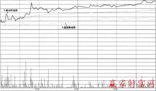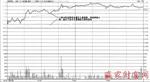 個股分時走勢強于大盤是指在盤內個股分時走勢圖中,股價走勢上漲的幅度和持續度都強于大盤,顯示著個股有很強的漲勢力量。個股分時走勢強于大盤的分時圖類型,分為完全強于大盤走勢和不完全強于大盤走勢兩種類型。前者所處的狀態是高調的漲勢中途,表明多頭力量高舉上漲大旗;后者所處的狀態是低調的漲勢階段,可能是由弱轉強的信號,也可能是由強轉弱的信號,具體都依據股價所處的位置來判斷。低價啟動區是由弱轉強,高價調整回落區則是由強轉弱。如圖所示,為個股分時走勢強于大盤的形態示意圖。