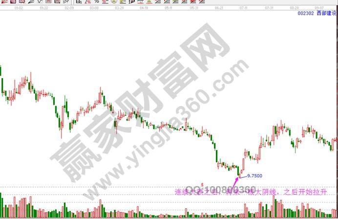 2. 在市場出現(xiàn)大幅下跌之后,也有可能出現(xiàn)大陰線,這里的大陰線暗示著市場的做空能量已經(jīng)差不多耗盡,按照物極必反原理,個股跌至一個程度之后,就要開始往相反的趨勢運行,這個時候,就可以考慮做多, 低吸一些股票了,這也是我們常說的主力挖坑的一種。