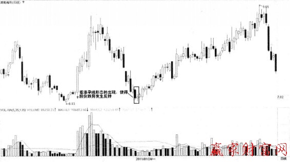 再如下圖所示,為湖南海利(600731)于2011年1月24日形成的看漲孕線形態。從圖中標志區可以看到,在前期市場趨勢單邊下降至低價區時,出現了看漲孕線使得跌勢終止,趨勢開始由弱轉強,各方買盤涌入,因而后市逐漸明朗,體現了看漲孕線在單邊下降趨勢的反轉作用。
