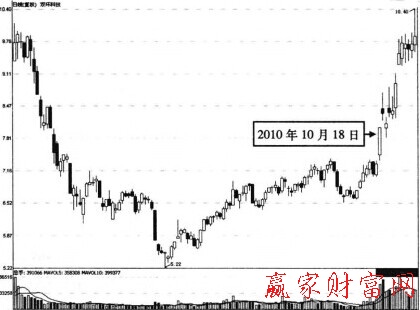 上圖為雙環(huán)科技(000707) 2010年4月20日至2010年11月2日期間的走勢圖。該股自持續(xù)上漲后的高位區(qū)開始出現(xiàn)大幅下跌走勢,在階段性的明顯低位區(qū)發(fā)生了企穩(wěn)回升的反彈走勢,且反彈走勢不急不緩,這一般都是多方力量開始積蓄的表現(xiàn),在圖中標(biāo)注所示,在2010年10月18日此股出現(xiàn)了一個向上跳空的漲停板形態(tài),結(jié)合此前的緩穩(wěn)反彈走勢,這時的漲停板預(yù)示著主力資金短期內(nèi)有意拉升個股,個股的短期反彈走勢也將進(jìn)入到加速階段。