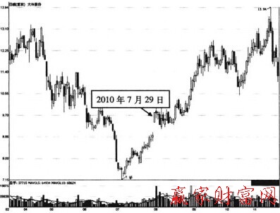 下圖所示為大冷股份(000530) 2010年3月26日至2010年11月17日期間的走勢圖。該股在深幅調(diào)整后的低位區(qū)有穩(wěn)健的反彈上漲走勢,且在2010年7月29日,該股在反彈中出現(xiàn)一個高開高走、強勢上封漲停板的K線形態(tài)。這種情況是主力資金短期有意強勢拉升個股的表現(xiàn),也預(yù)示著一波強勢的反彈上漲走勢將要開始。由于個股前期的下跌幅度較大,造成階段性的反彈幅度很小,所以在實盤操作中,投資者可以進(jìn)行較為積極地追漲買股操作。