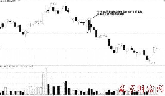 如圖所示,為華微電子(600360)于2011年11月30日形成的助跌長陰K線形態。從圖中標志區可以看到,此時該K線形態的出現,很必然地制造了大量的拋售恐慌,但恐慌中的散戶往往不知所措,之后也必然是漫長的跌勢。遇到此類K線形態時,投資者應果斷斬倉,哪怕只是誘空行為,也不能損兵折將。
