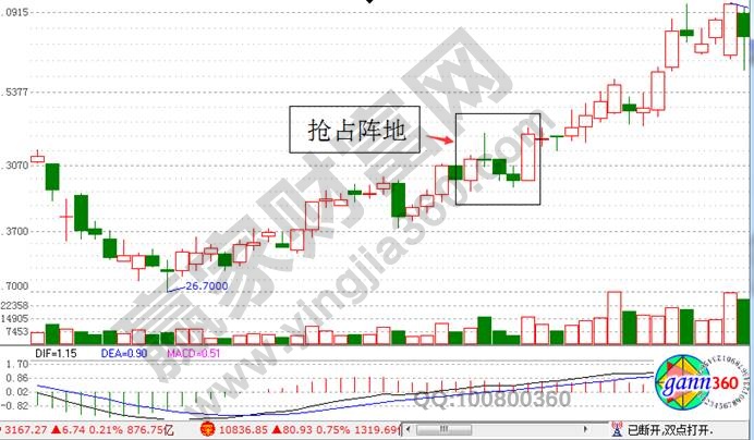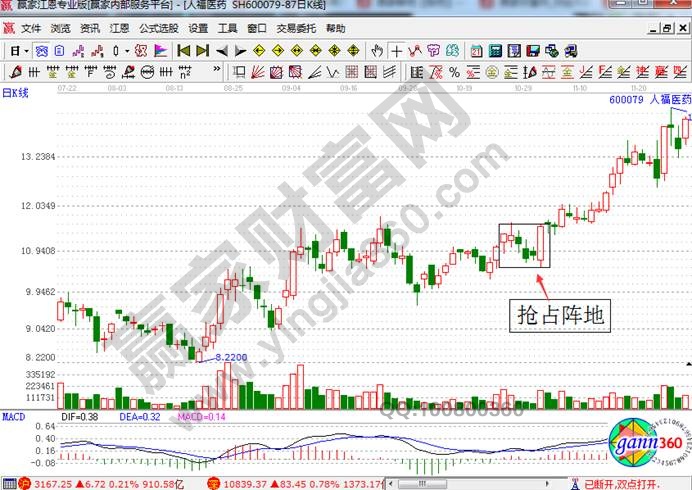 上圖是人福醫藥在2009年10月份的走勢圖,圖中所圈住的地方就是典型的搶占陣地形態。當時在10月23日和26日這兩個交易日陽線上攻,接著股價并沒有繼續拉升,而是選擇了穩固陣地,連續的收出了4根短的K線,有陰有陽,但是成交來個能出現明顯縮量,之后是一根陽線拔地而起。顯然是經過穩固之后,多頭繼續搶占陣地。