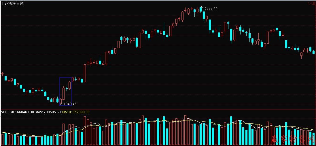 第四根K線:如果第四根K線為陽線,成交量往往會繼續放大,一輪上升行情就此確立。如果是一根陰線,成交量就會縮小,說明市場將再度走弱。