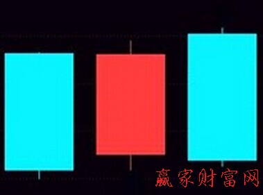 2.兩陽夾一陰在上升途中,大陽線后接一根縮量的陰線,如果次日又出現(xiàn)一根放量的陽線,稱為兩陽夾一陰K線組合,后市看漲。如示意圖。