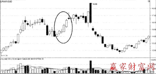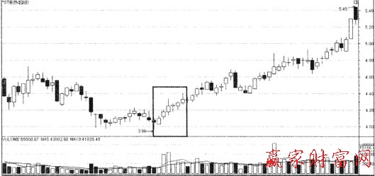 所謂低檔五根陽線是指在下跌持續(xù)一段時期后,K線圖連續(xù)出現(xiàn)了五根陽線(有時可能是六根或七根),表示在此價位多方承接力量較強。低檔五根陽線的圖形如圖所示。