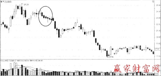 一般而言,在高位盤整中突然出現(xiàn)連續(xù)五陰線,此為行情看壞的明證。在上端連出五陰線,表示空頭固守陣線不退讓,隨后多頭可能將拋售了結(jié)。