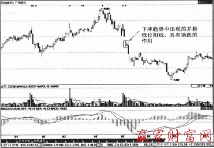 股價在經(jīng)過一段時間的下跌后出現(xiàn)了一根跳空低開的陽線,止收盤時仍留下一個缺口,緊接著又出現(xiàn)一根與之并列的陽線,而且成交量也隨著逐漸放大,這就是看跌并排陽線。